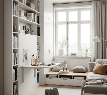 Ve stísněném prostoru je potřeba myslet vertikálně. Využij stěny až ke stropu – police, vysoké skříňky, knihovny.